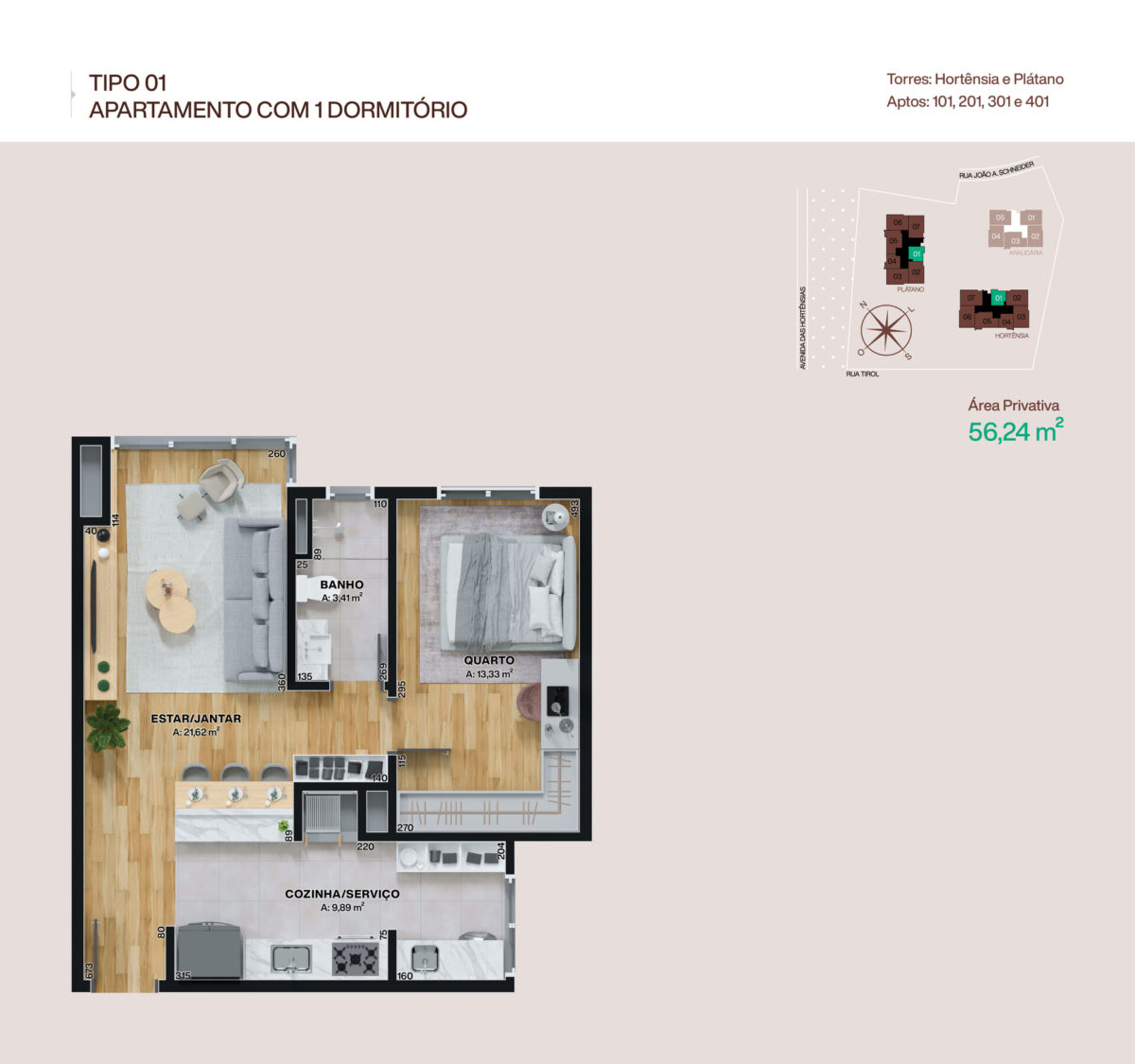 - Apartamento 301, situado na Torre Hortênsia