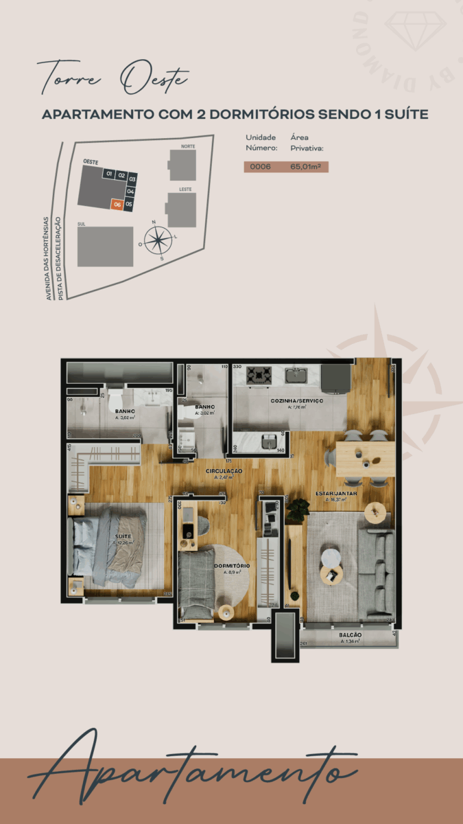 • Apartamento 0006, situado na Torre Oeste