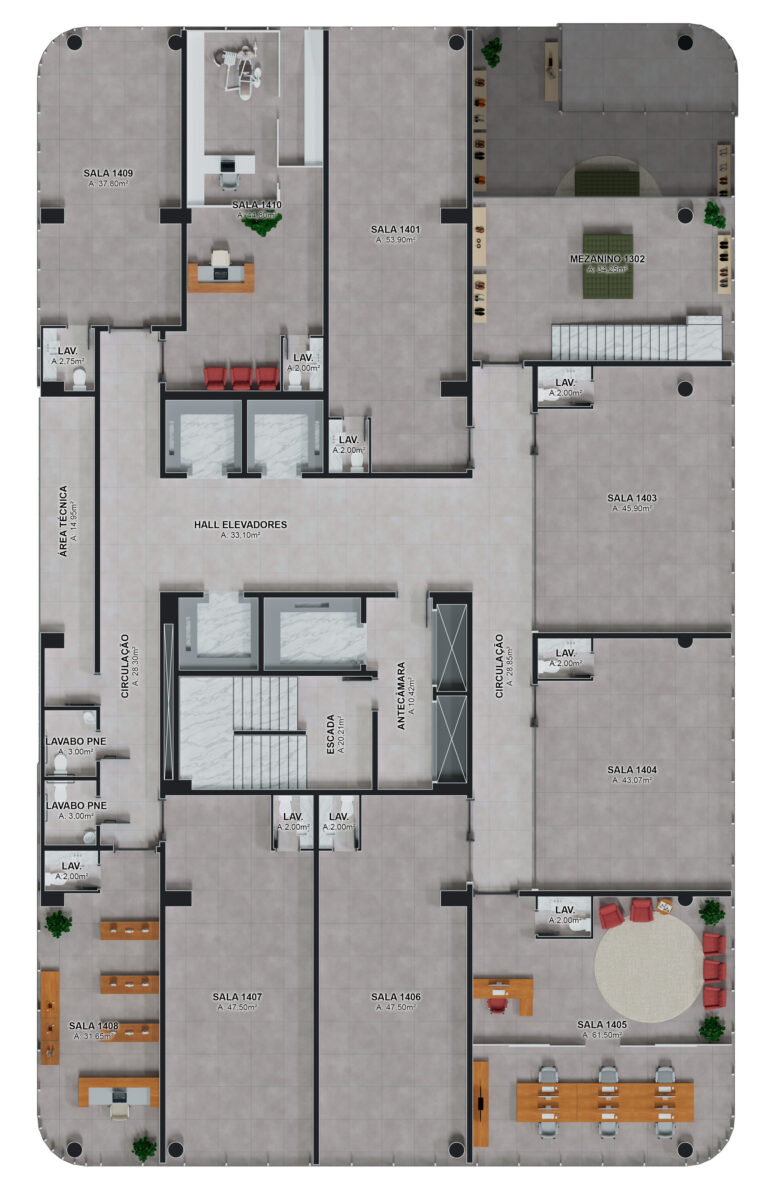 - Com lajes corporativas amplas e modulares;