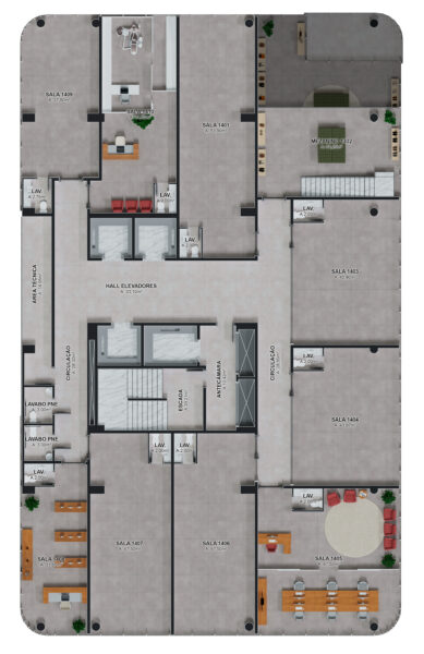 - Com lajes corporativas amplas e modulares;