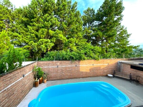 A piscina convida a momentos de lazer e relaxamento, enquanto o entorno da propriedade é delimitado por cercas e muros, proporcionando privacidade e segurança. O portão eletrônico assegura a entrada controlada e conveniente, completando as comodidades desta residência extraordinária.