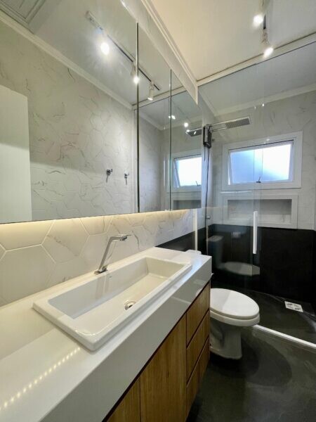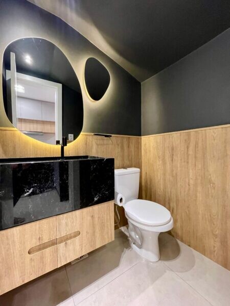 - Possui um banheiro social completo e um lavabo adicional, ambos com acabamentos de qualidade.