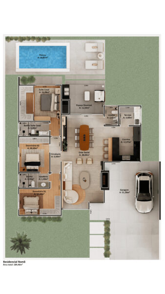 O espaço gourmet, ideal para momentos especiais, integra-se ao pátio com piscina — um convite ao lazer e à descontração. A garagem acomoda até 2 veículos e o terreno oferece pátio tanto na frente quanto nos fundos, unindo funcionalidade e estilo.