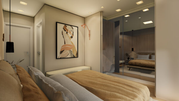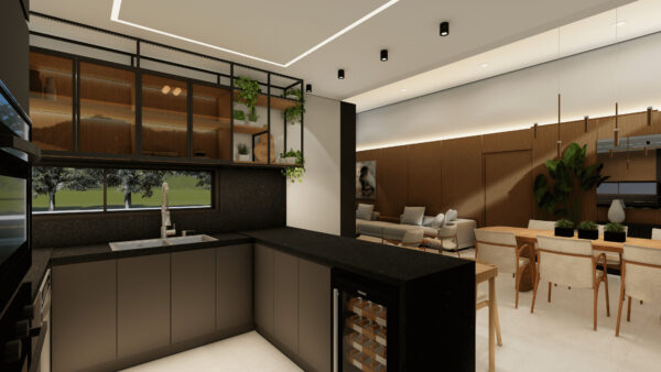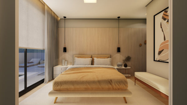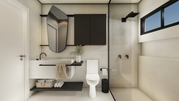 O acabamento de alto padrão combina o aconchego do piso laminado com a elegância do porcelanato. As aberturas em alumínio preto e as persianas automatizadas reforçam o design contemporâneo, enquanto as esperas para água quente, aquecimento solar, automação e split garantem conforto térmico e praticidade em todas as estações.