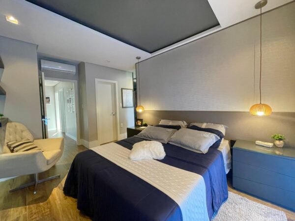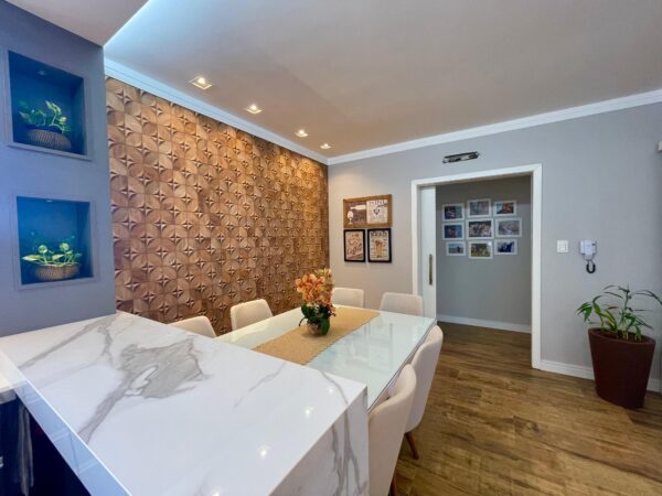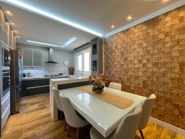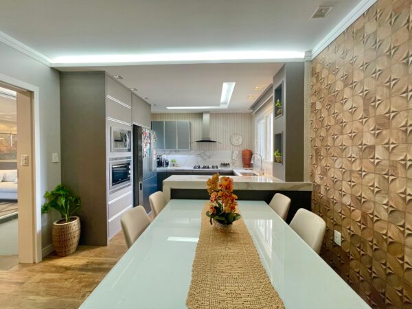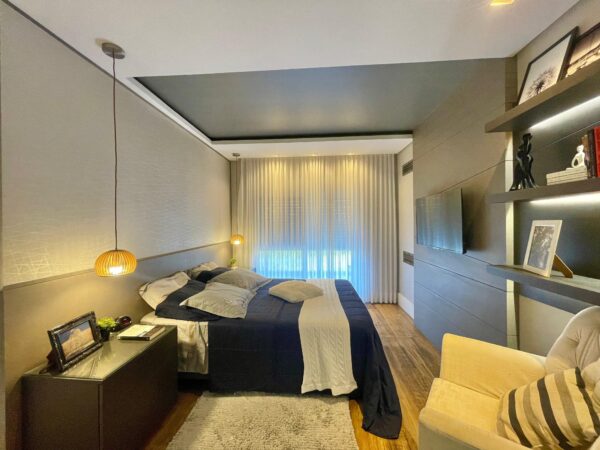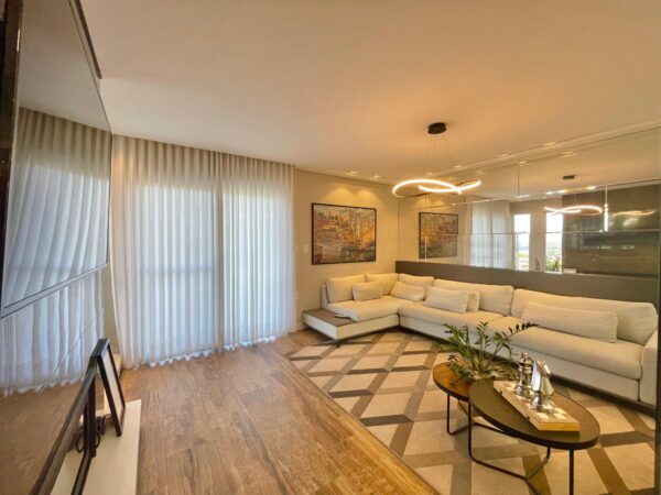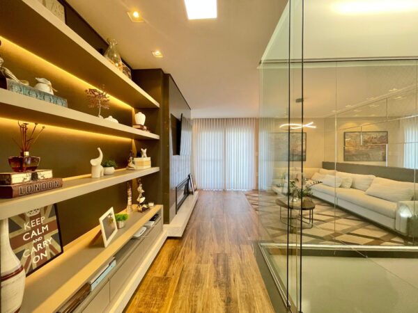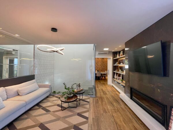 Os pisos em laminado e porcelanato se harmonizam com a lareira aconchegante, criando ambientes que respiram conforto e charme. A sacada com vista panorâmica é um convite diário para apreciar a paisagem enquanto desfruta da tranquilidade do seu espaço.