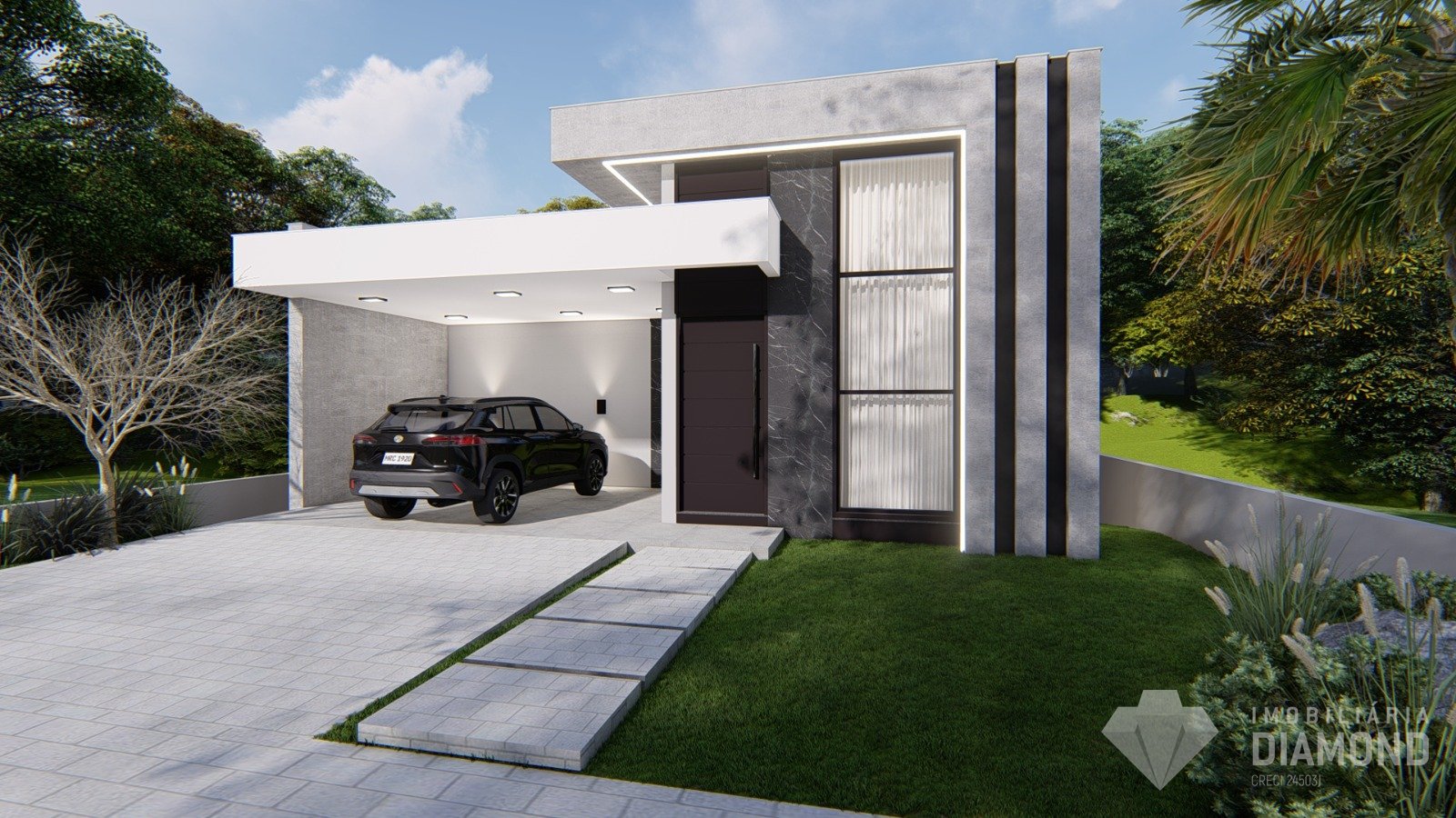 Destaca-se pela sala com pé direito alto, lareira e rebaixo em gesso em toda a casa