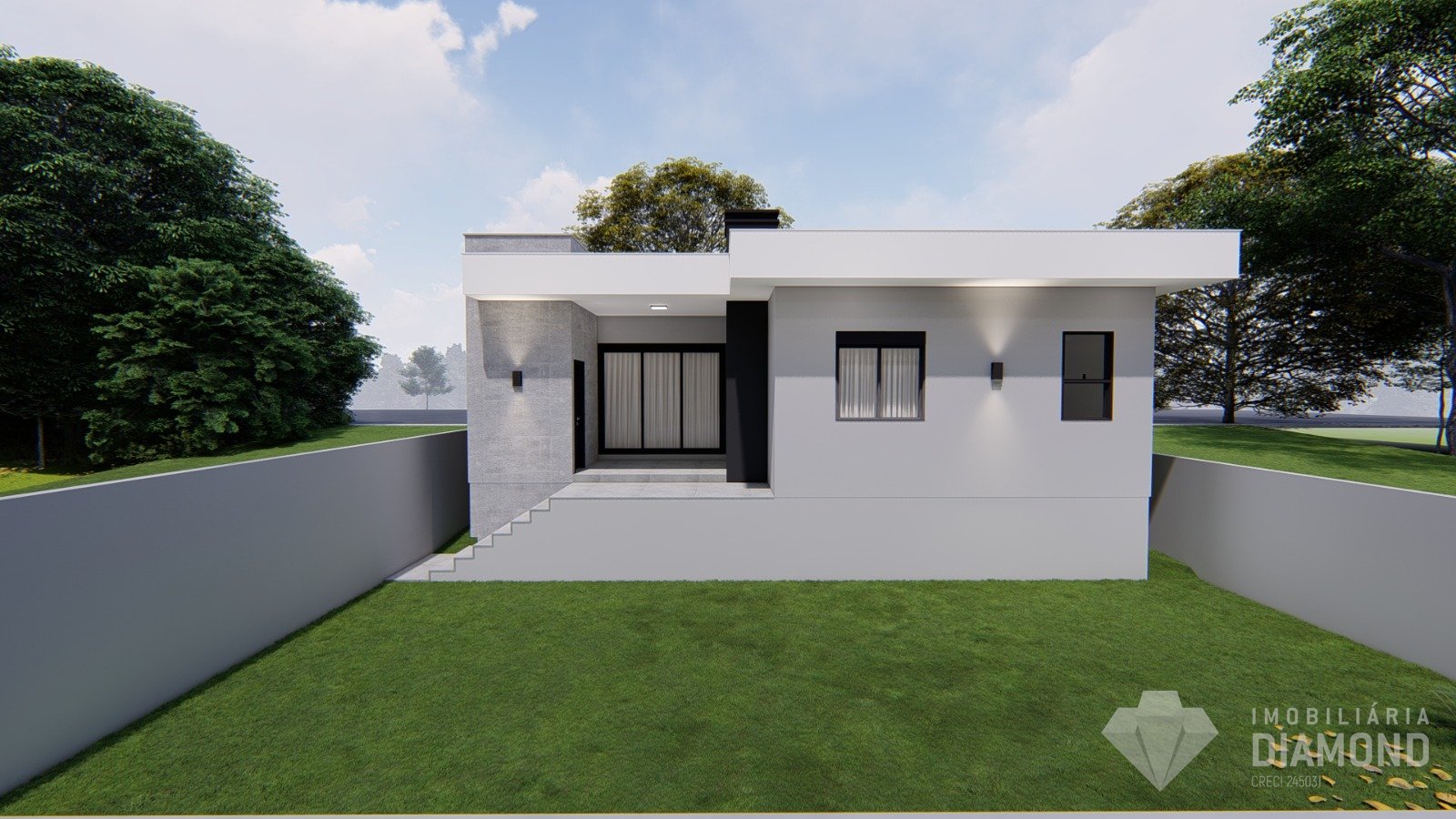Inclui garagem para 2 carros e pátios murados na frente e nos fundos