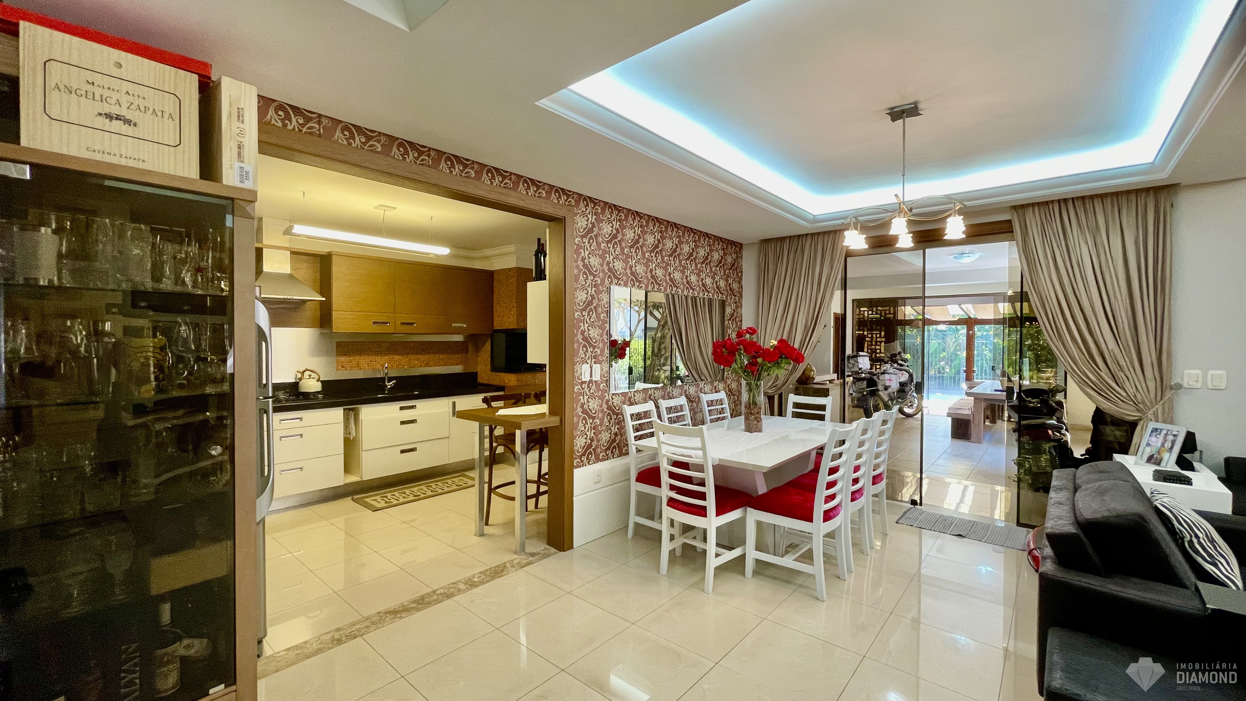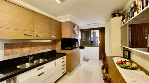 Dispõe de área social completa com salas de estar e jantar, mezanino, lareira e fogão a lenha
