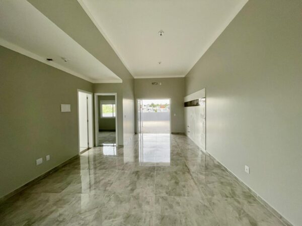 Sala de estar, jantar e cozinha integradas;
