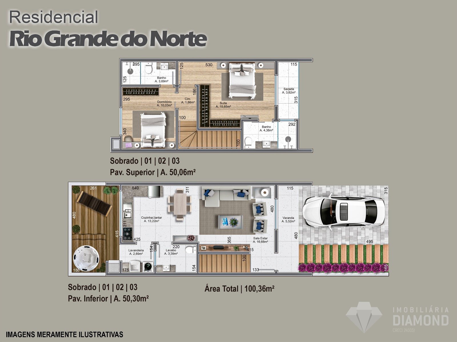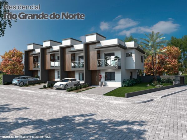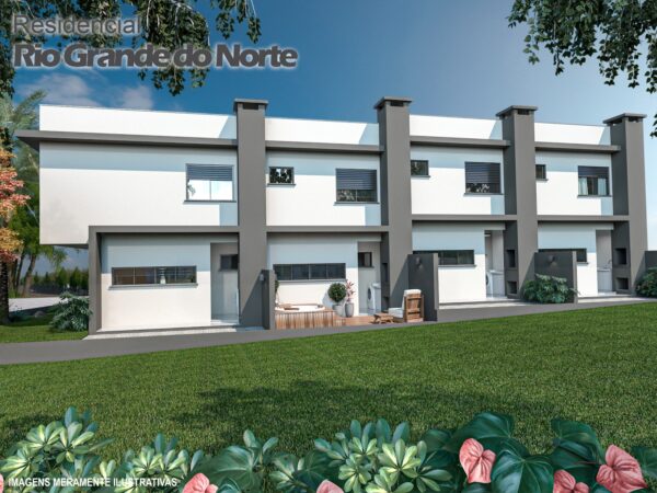 • Apresenta acabamentos: piso laminado na área íntima, porcelanato nas demais áreas, portas internas em PVC branco e corrimão em inox