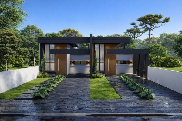Apresenta 70 m² de área construída em um terreno privativo de 6,61×27,26m, dispondo de 3 dormitórios, 1 banheiro social e área de convivência integrada com pé direito alto.