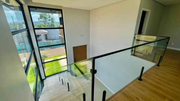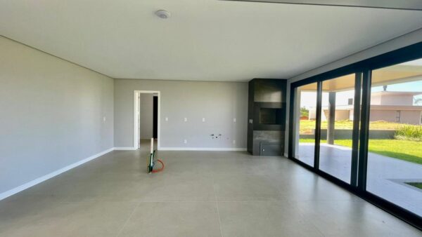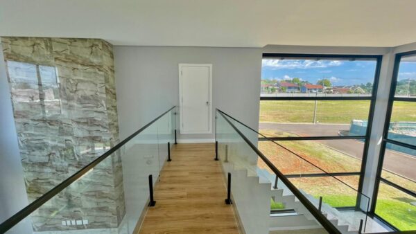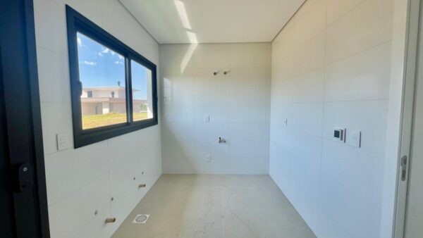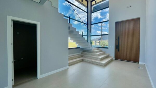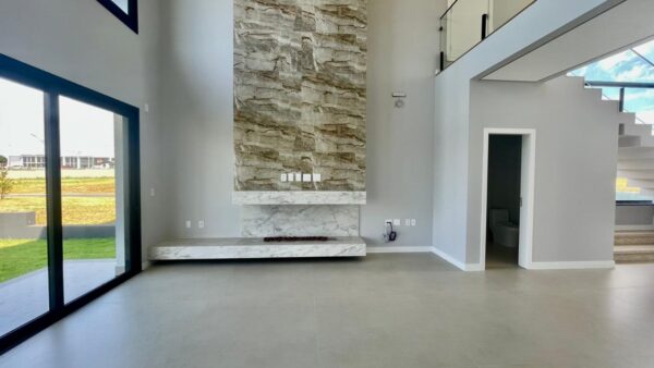 Apresenta ambientes amplos e sofisticados com pé direito elevado, englobando hall de entrada, sala de estar e estar social, cozinha grande e área de serviço separada.