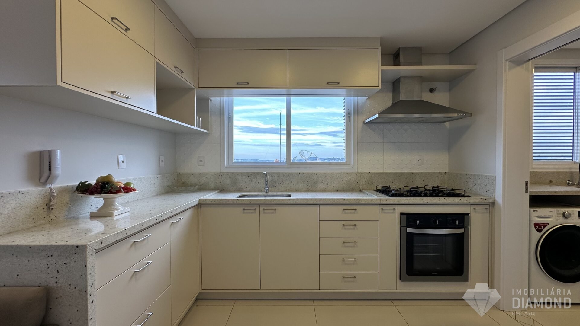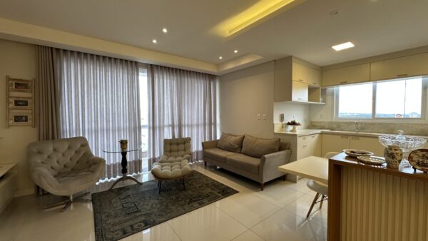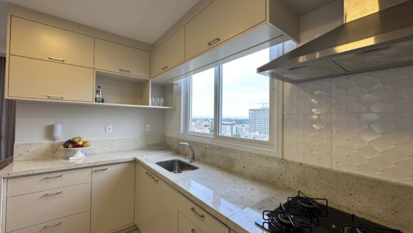 Apartamento completo com iluminação direta e sol da manhã, sacada com churrasqueira, vista belíssima para o vale, uma suíte com closet mobiliado e banheira + dois dormitórios com móveis sob medida. A cozinha deste lar mantém toda família reunida enquanto as refeições são preparadas, pois ela integra a sala de estar com sala de jantar e sacada. Persianas dos dormitórios são automatizadas. A lavanderia é grande e separada, ótimo espaço.